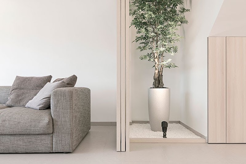 En el centro de la planta, un árbol sobre un lecho de cantos rodados blancos, resaltado por una luz de acento, sirve para crear un pequeño jardín interior que no entorpece el paso de la luz ni de la ventilación, convirtiéndose en un elemento clave del proyecto. Las hojas verdes de la planta encajan con la paleta de colores simple pero elegante del resto de apartamento: blancos, grises, acentos negros y tonos de madera son frecuentes tantos en el mobiliario como en los elementos arquitectónicos.